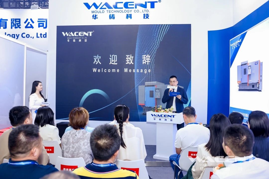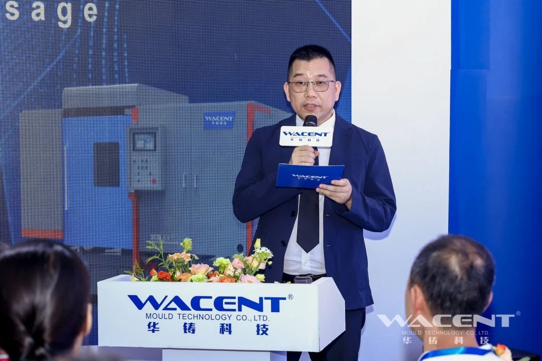 华铸科技总经理李灿明先生致辞 在发布会上,华铸科技总经理李灿明先生详细阐述了这款压铸机的创新之处。他介绍道,该设备采用了从分型面直接进料的独特结构设计,这一革命性设计将进料口尺寸缩减至极致,从而实现了热室压铸生产节拍的飞跃。生产出的压铸件不仅无料咀、无披锋,而且生产效率与产品品质均达到了新高度。更重要的是,由于毛坯件物料消耗的减少,锌合金材料成本得以显著降低,为企业带来了实实在在的经济效益。