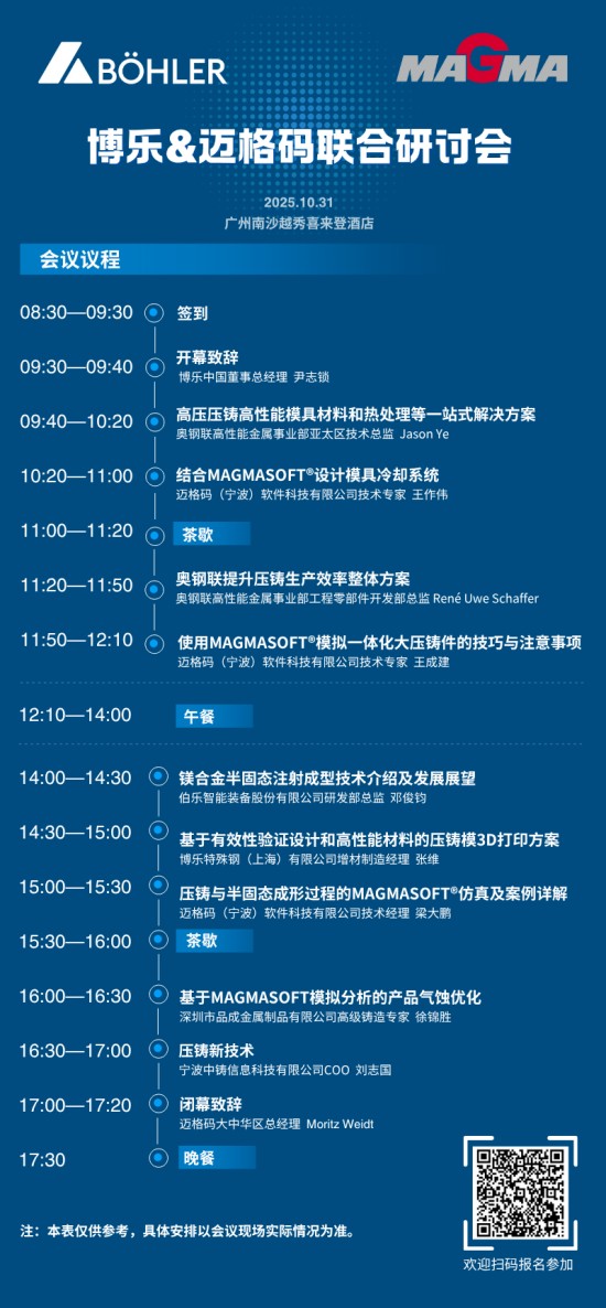 2025年10月31日,博乐特殊钢、迈格码联合压铸研讨会,将于广东省广州市南沙越秀喜来登酒店举行。