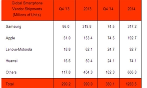 2014年全球智能手机出货量增3成至13亿部